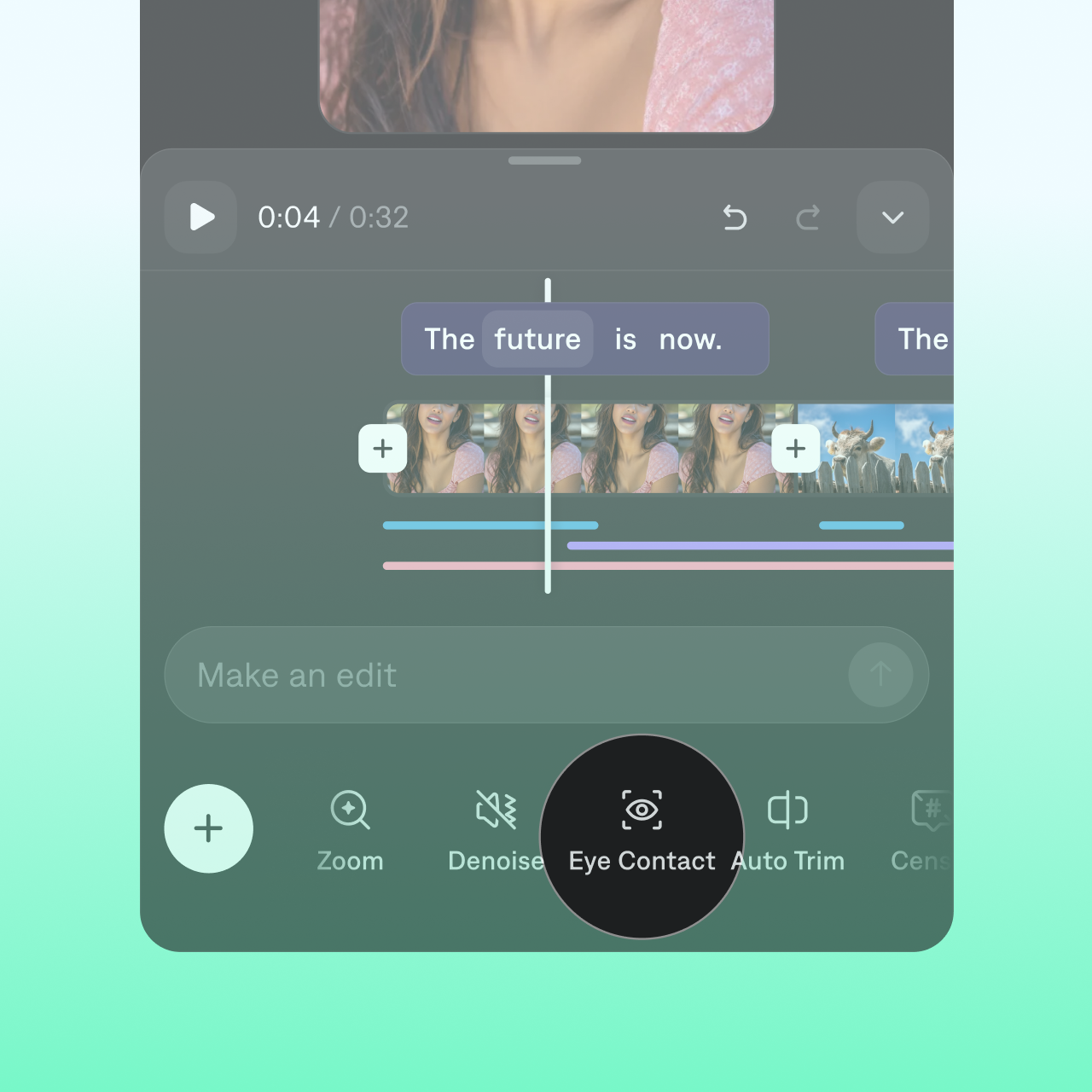Upload a video or record new footage in the Captions app. In the editing window, select "Eye Contact" to apply changes. An easy fix, ready to export.